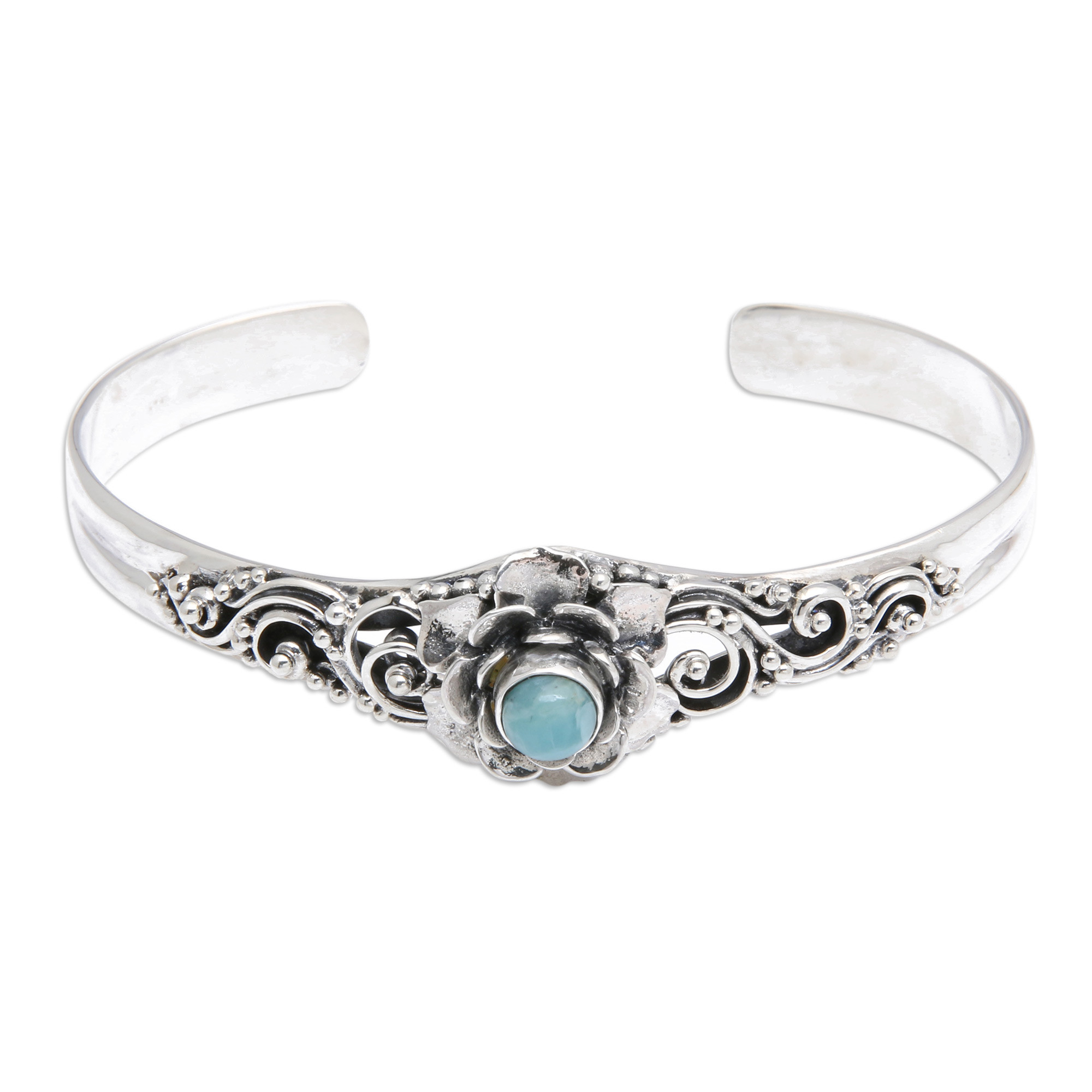 Elevate your ensemble with this stunning cuff bracelet inspired by the natural grace of flowers and adorned with a mesmerizing larimar stone. The vibrant gemstone crowns a sterling silver setting boasting intricate details and a harmonious blend of oxidized and polished finishes. Balinese artisan Buana's chic design promises to add a touch of sophistication and charm to your look.