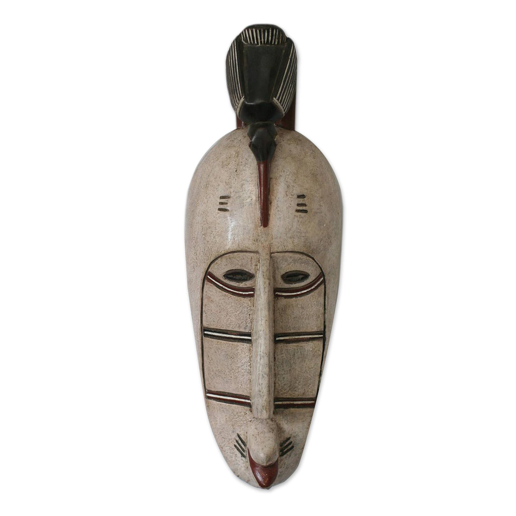 Perched atop an elongated mask coated in white clay, a bird leans down to caress its forehead. Salihu Ibrahim carves the piece by hand in the style of the Senufo people of Mali and the northern Cote d'Ivoire. "Masks like this are worn by hunters before setting out to hunt," he says. "It is believed the wearing of the mask gives good luck as white is a lucky color." The red pigments are achieved by grinding a red stone, while charcoal provides the black accents.