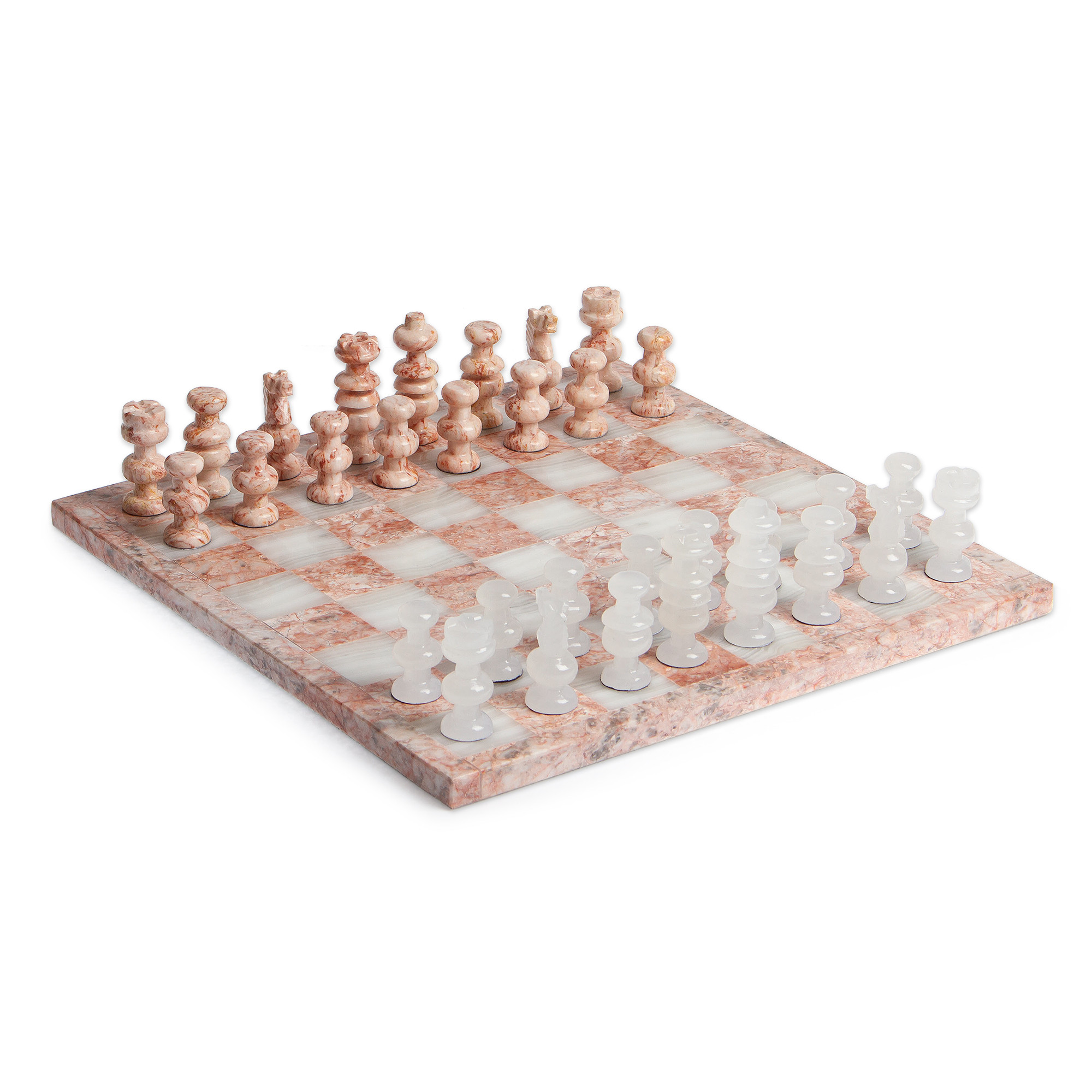 Modern Hand-Carved White Onyx and Pink Marble Chess Set, 'Riveting Challenge'