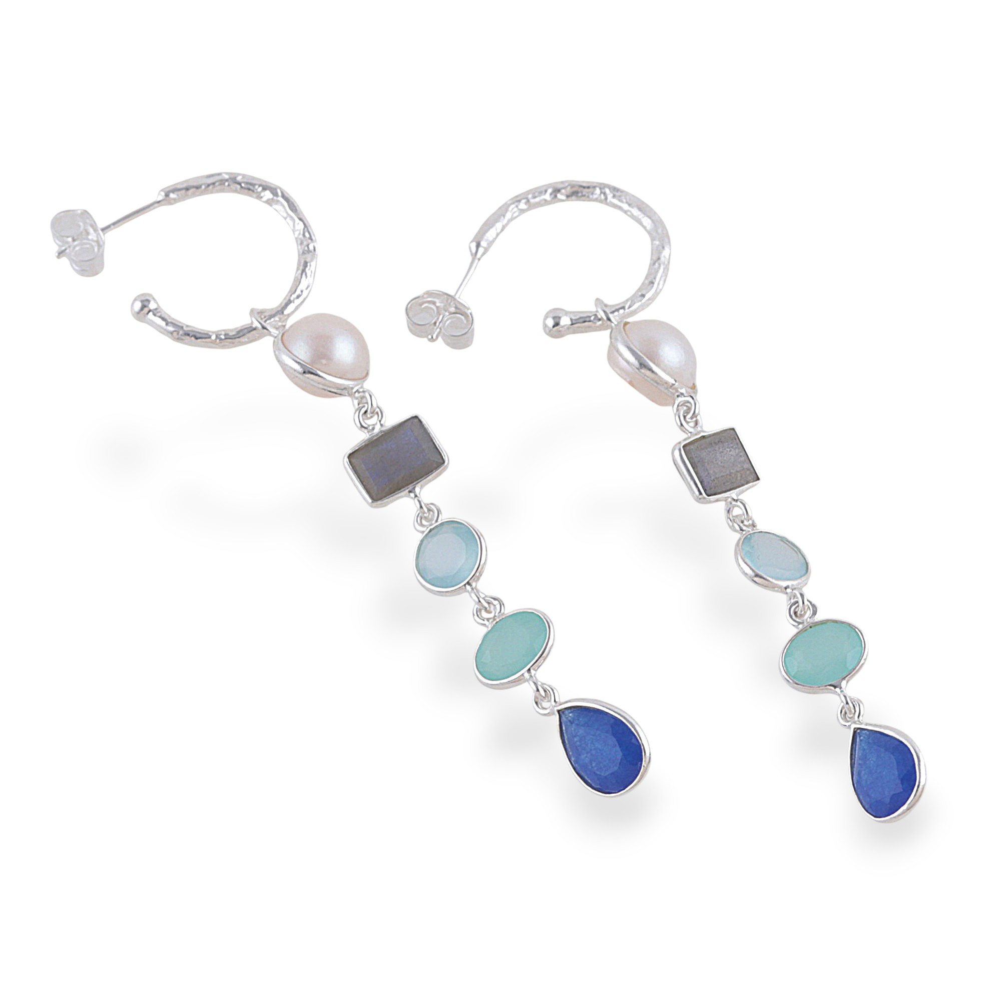 Multi-Gemstone Silver Statement Half-Hoop Dangle Earrings, 'Ocean Harmony'