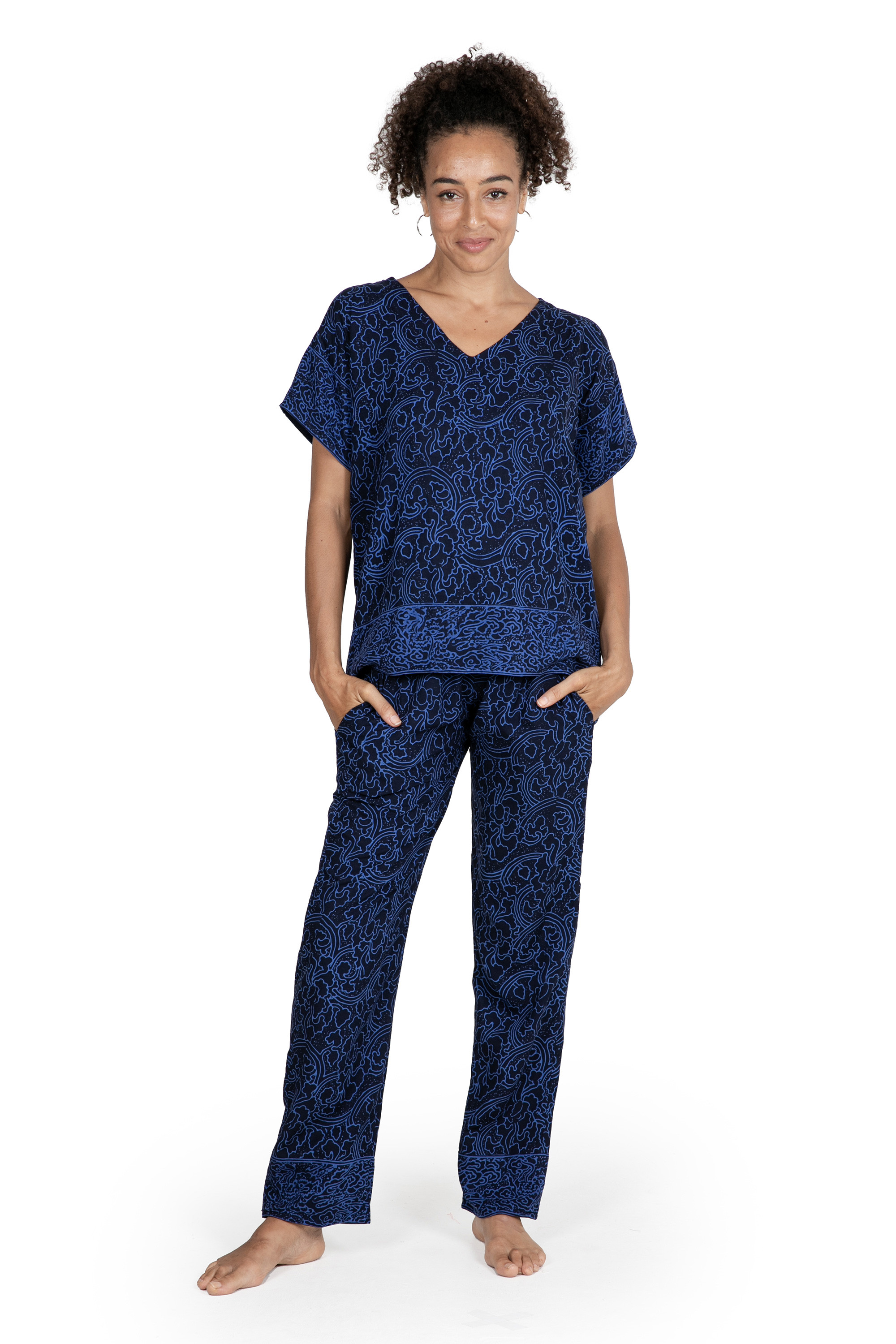Navy and Amethyst Rayon Batik Pajama Set from Indonesia, 'Blue Orchid'