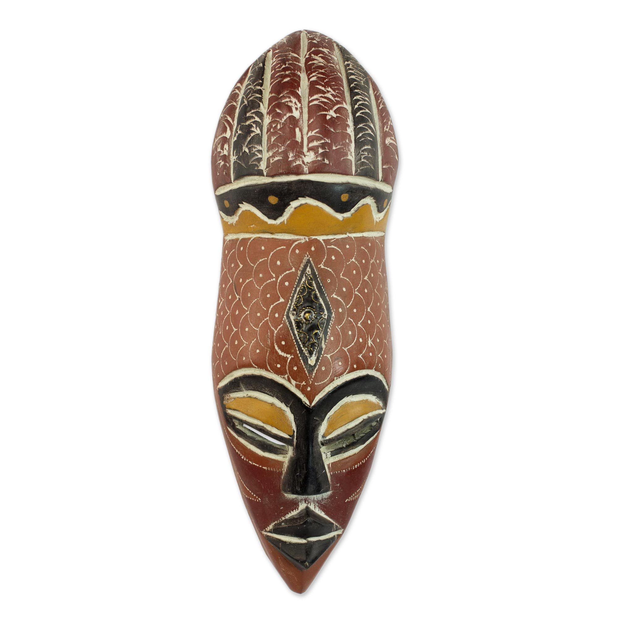 Brilliant color conveys both joy and gratitude in this elegant mask by Abdul Aziz Mohamadu. Symmetrical features narrow from wide eyes to a narrow chin and voluptuous lips, while aluminum repoussé creates a triangle on the wide forehead. "This mask is used by the Goroshie tribe in Nigeria during their harvest festival called Motaka Rafi," the artisan explains. He names this exquisite piece Bawule – a Hausa word meaning "God gives."