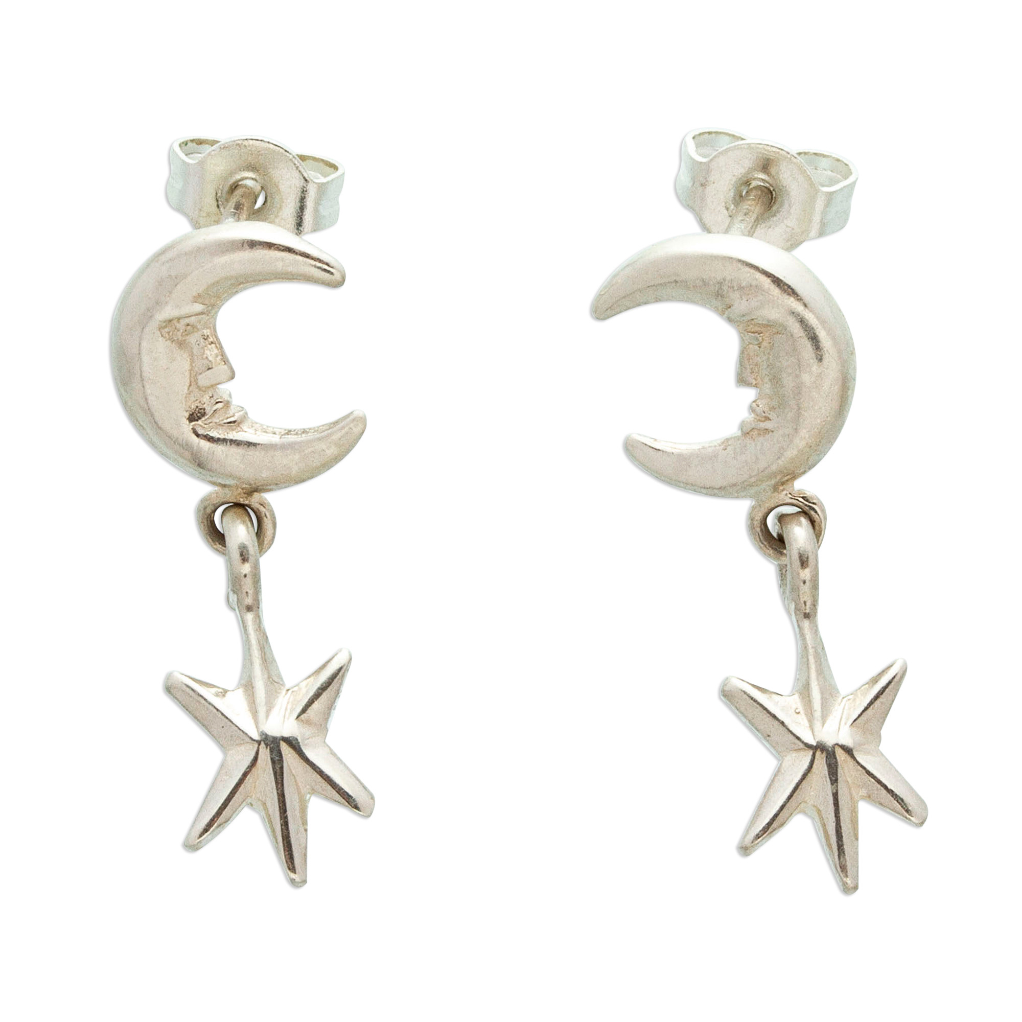 Night-Themed Moon and Star Sterling Silver Dangle Earrings, 'Dream of Midnight'