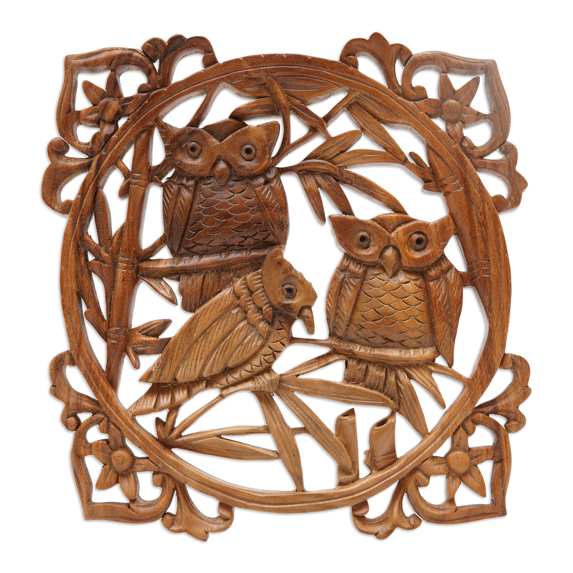 In a bamboo forest, three charming owls pose for a family portrait in this panel presented by Eka from Indonesia. Hand carved from suar wood, the wall hanging is accented with small flowers at each of the four corners and finished in a natural wood color.