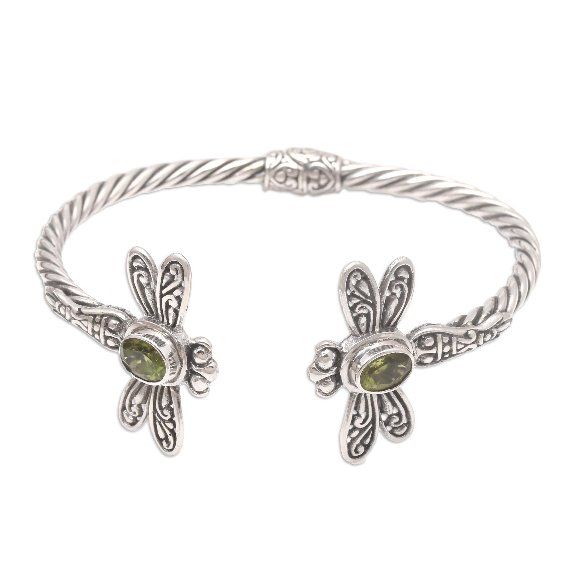 Peridot cuff bracelet, 'Soft Flutter in Green' - Peridot Cuff Bracelet with Dragonfly Motif