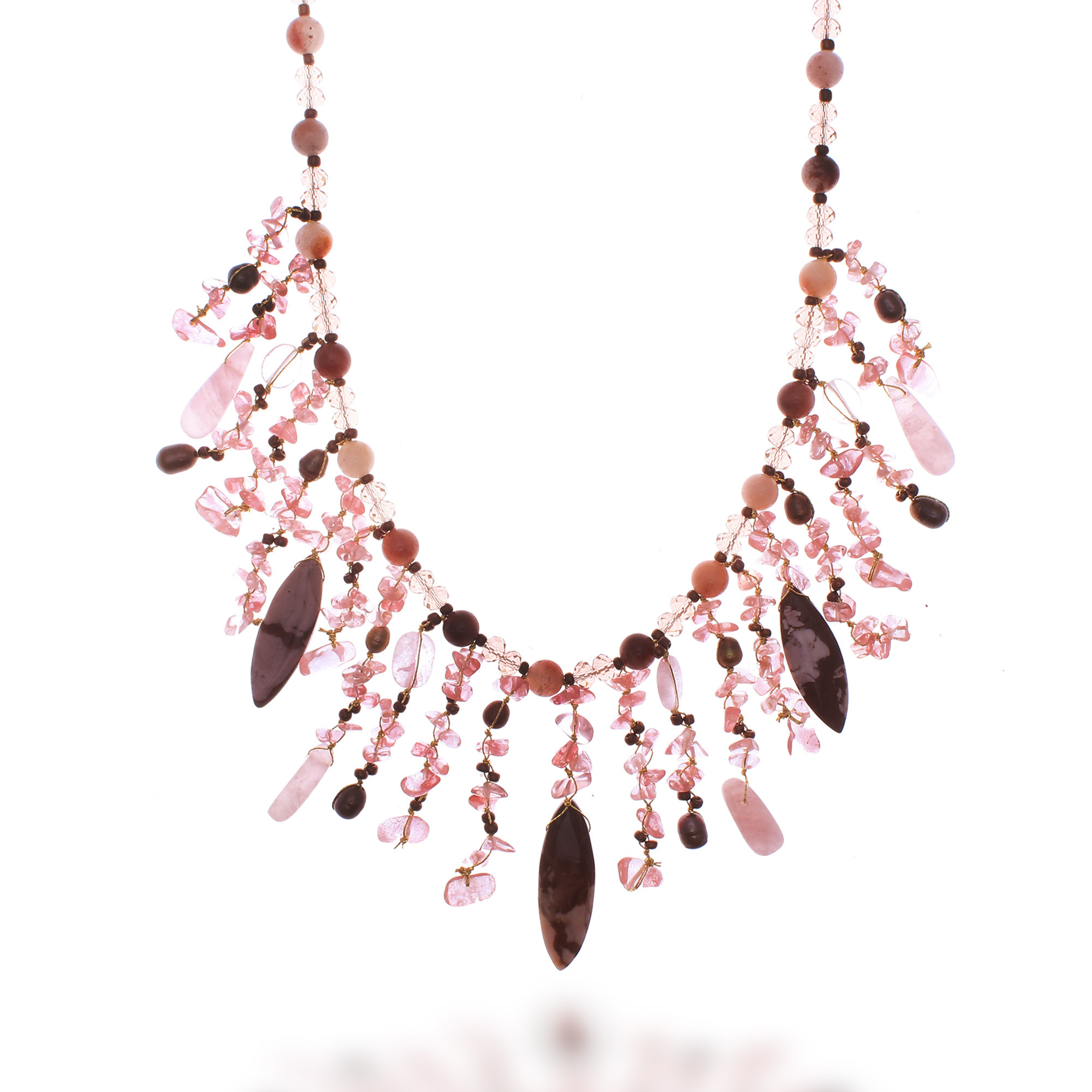 Stunning and stylish, this necklace is another fascinating creation by Thailand's Nareerat, who works with multiple jewels in a palette of warm tones. The artisan uses metallic threads to join rose quartz, jasper and glass beads, creating a design that resembles a pink waterfall with dangling cultured pearls. As a final touch, Nareerat includes a sterling silver-plated clasp and extender for a comfortable fit.