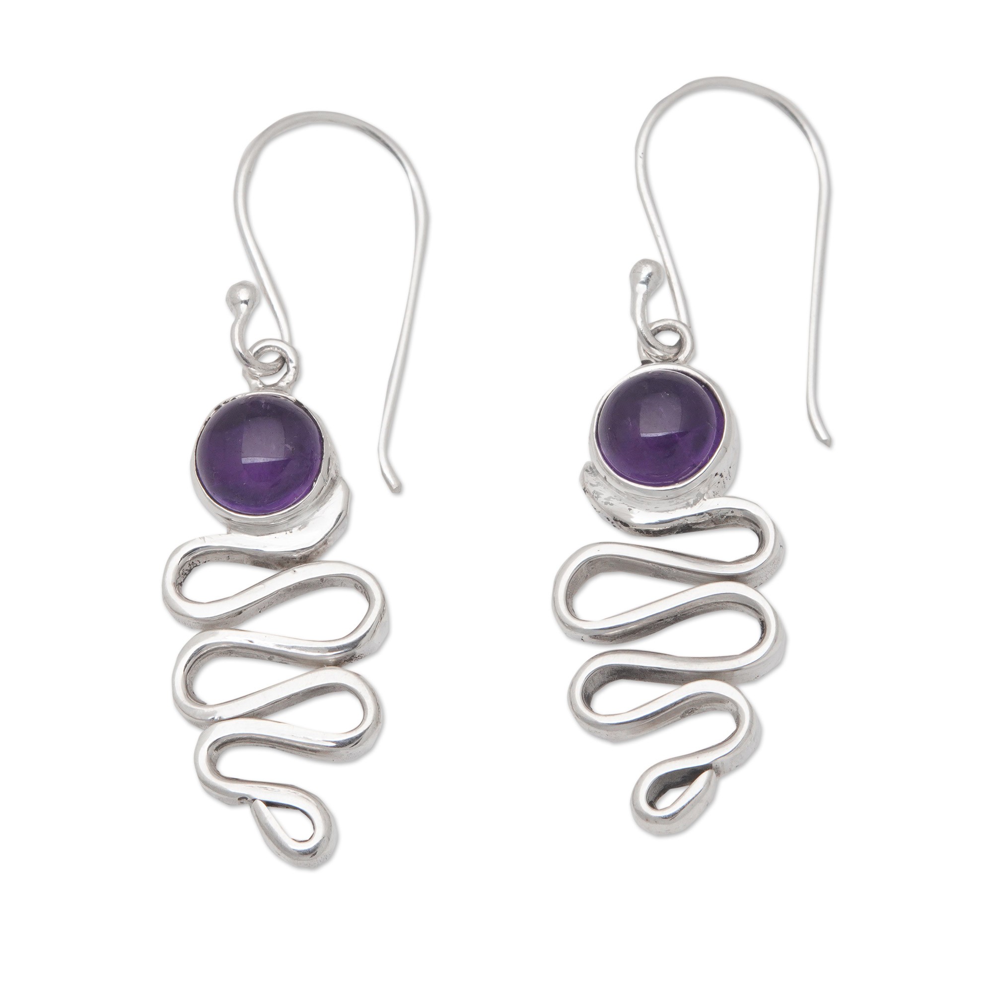 Polished Sterling Silver and Amethyst Dangle Earrings, 'Zigzag Wisdom'