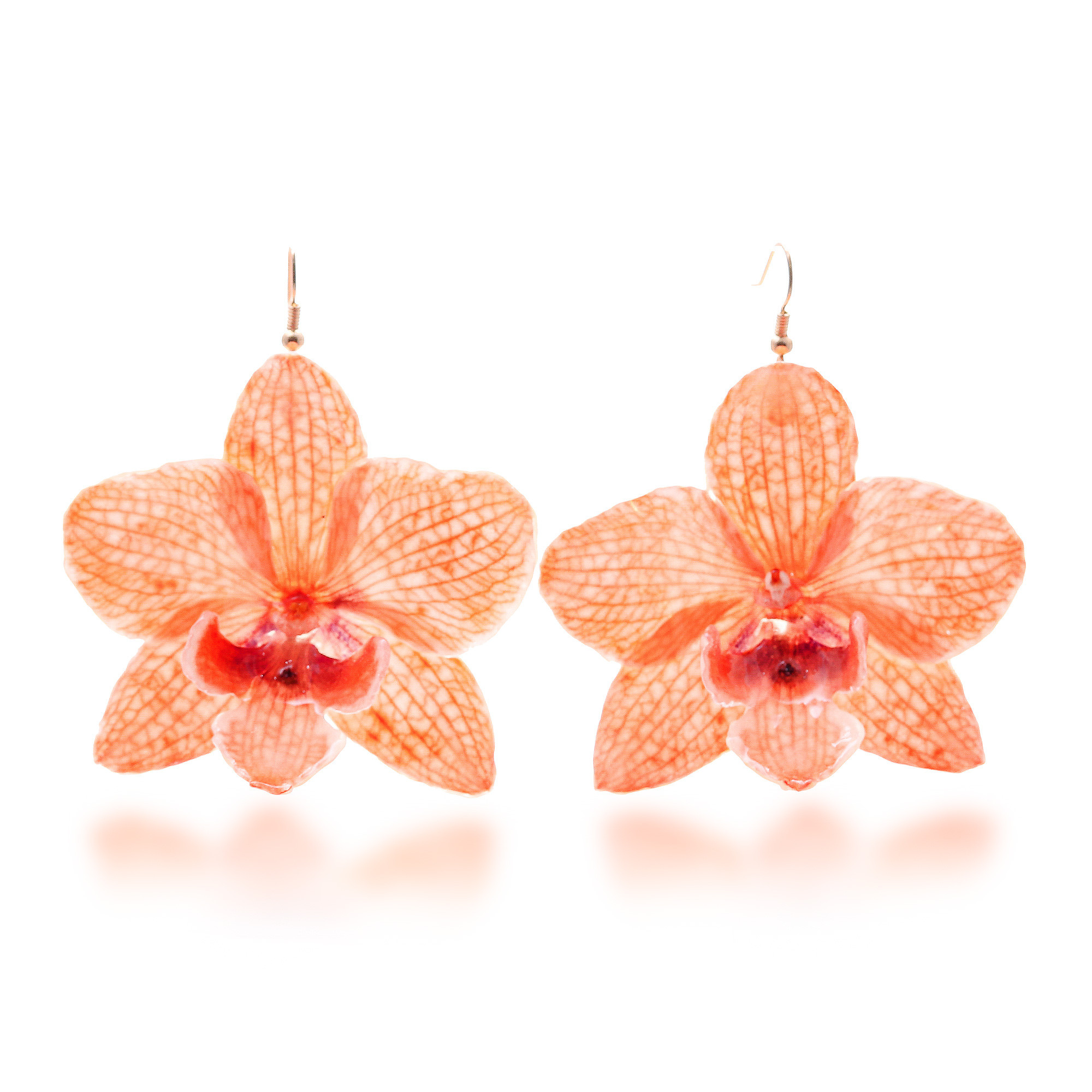 - Resin-coated orchid petals; 22k gold-plated brass hooks