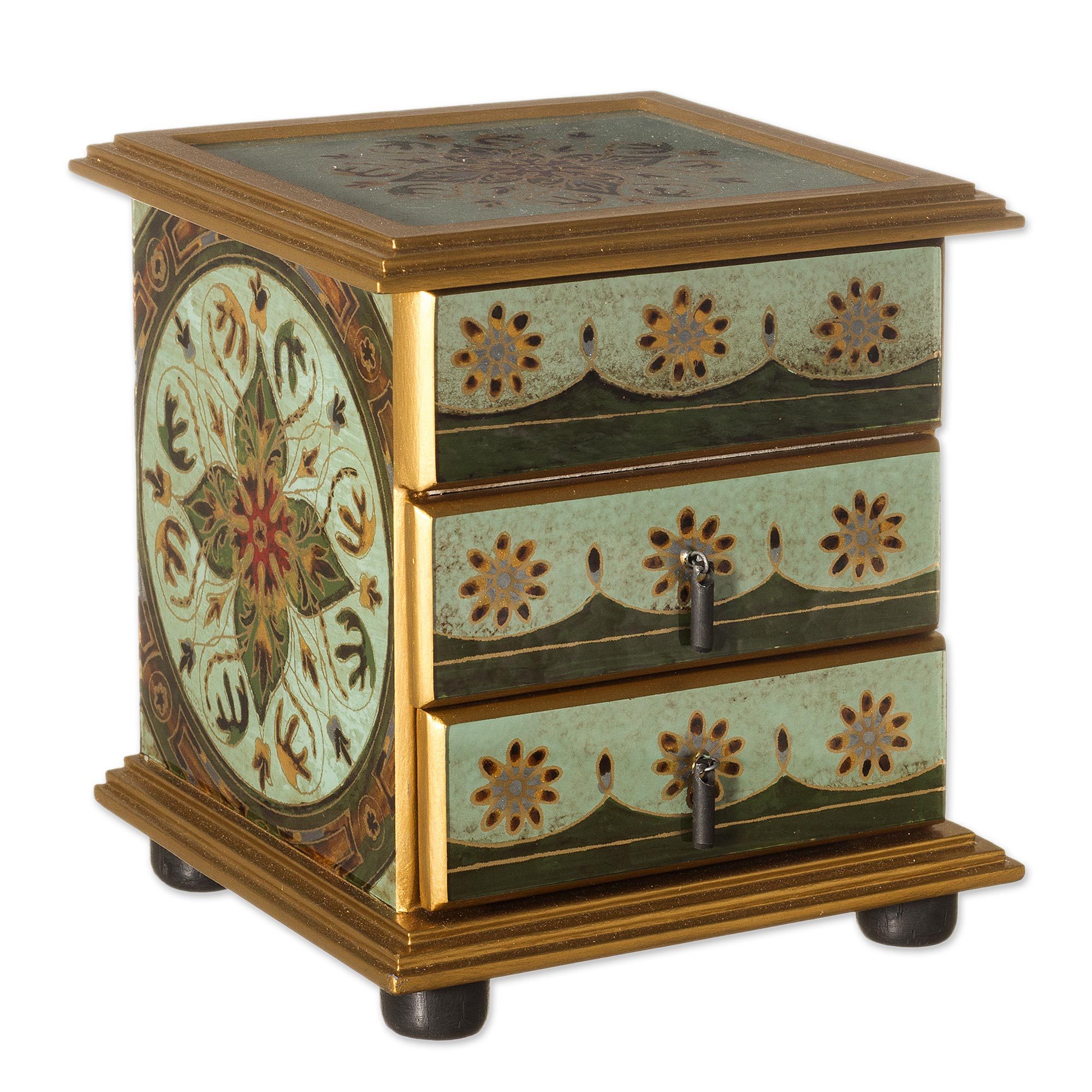 Reverse Painted Glass Jewelry Box from Peru, 'Light Green Mandala'