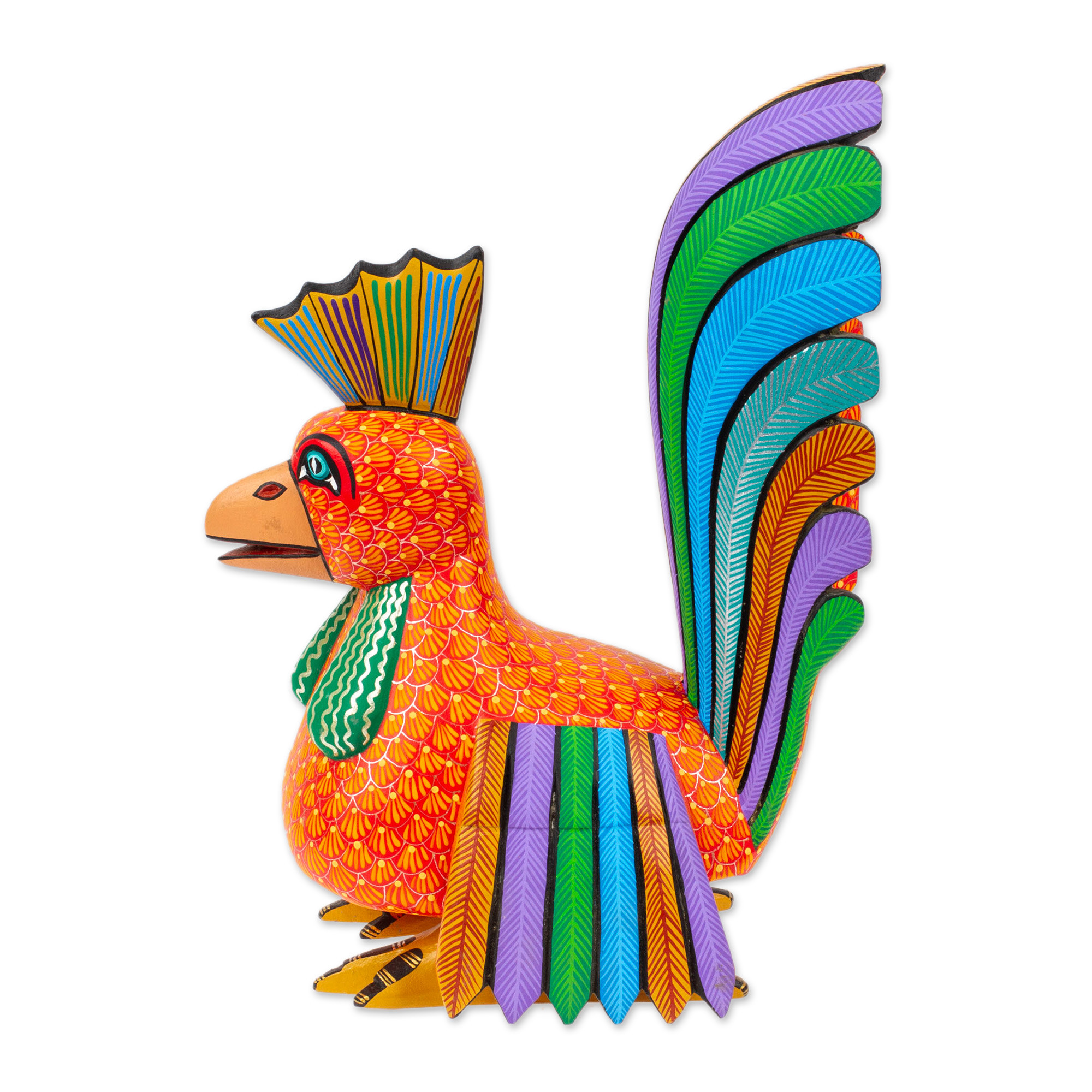 With bright feathers and comb erect, a proud rooster announces the imminent dawn. Zeny and Reyna transform found pieces of copal wood into a delightful alebrije. These fanciful sculptures are a traditional folk art in Oaxaca, once based on twenty totems but today representing all kinds of animals. They take their name from a Calo gypsy word for "something difficult, tangled, confusing or fantastic."