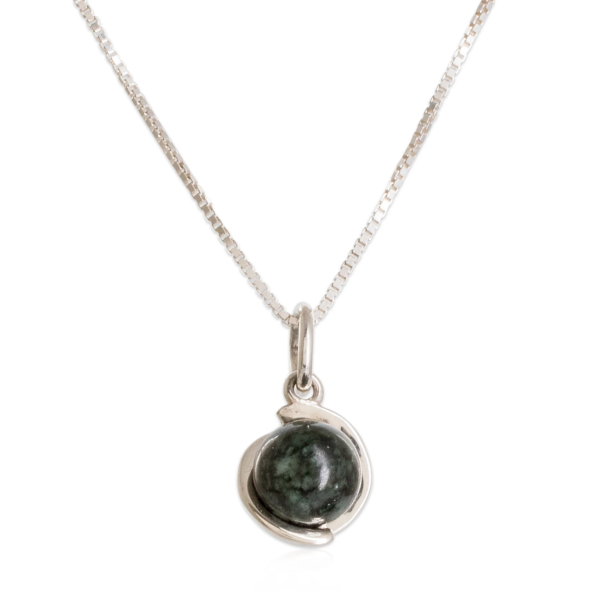 Round Dark Green Jade and Sterling Silver Pendant Necklace, 'Dark Green Magic Silhouette'