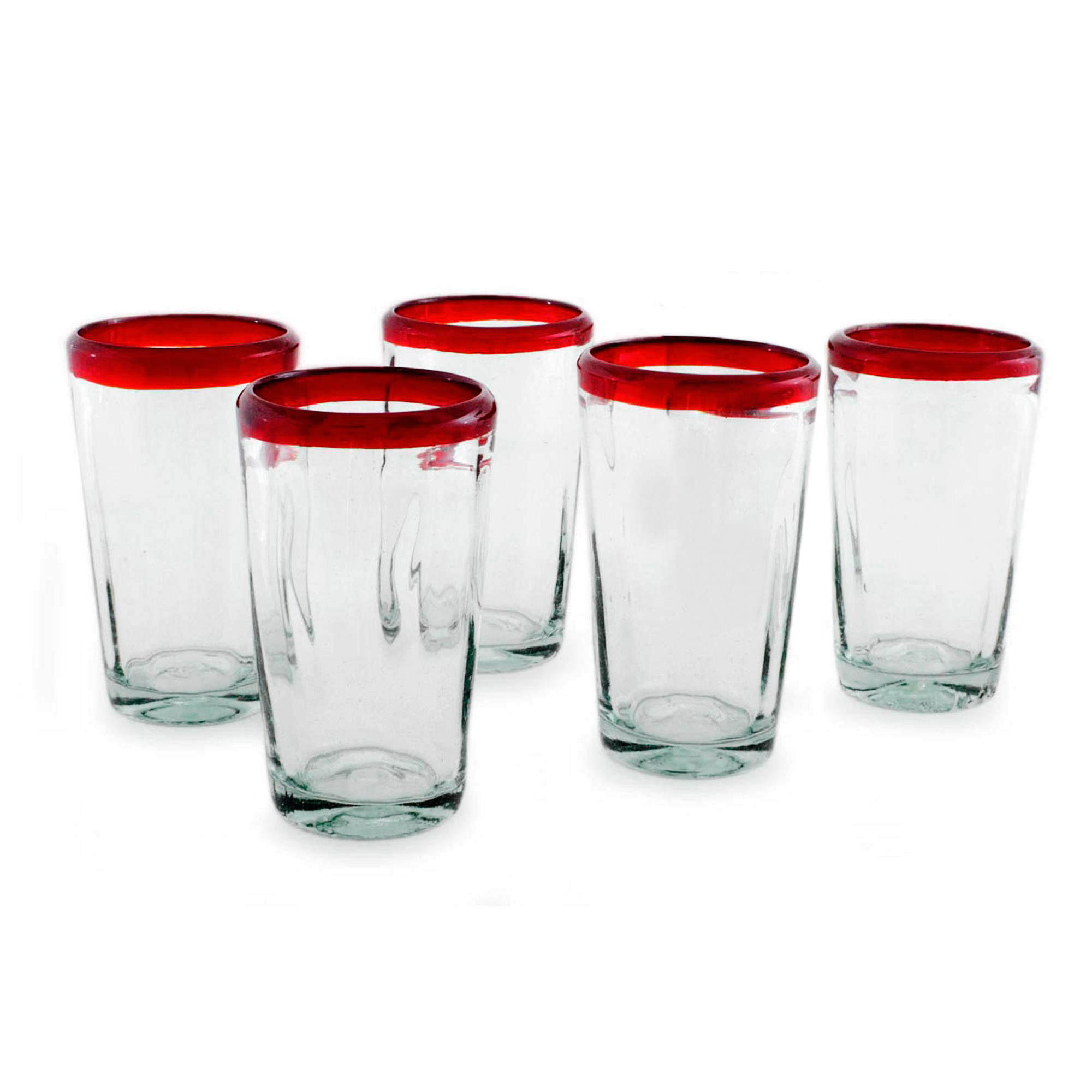 Set of 5 Mexican Red Rim Recycled Glass Drinking Glasses, 'Ruby Groove'