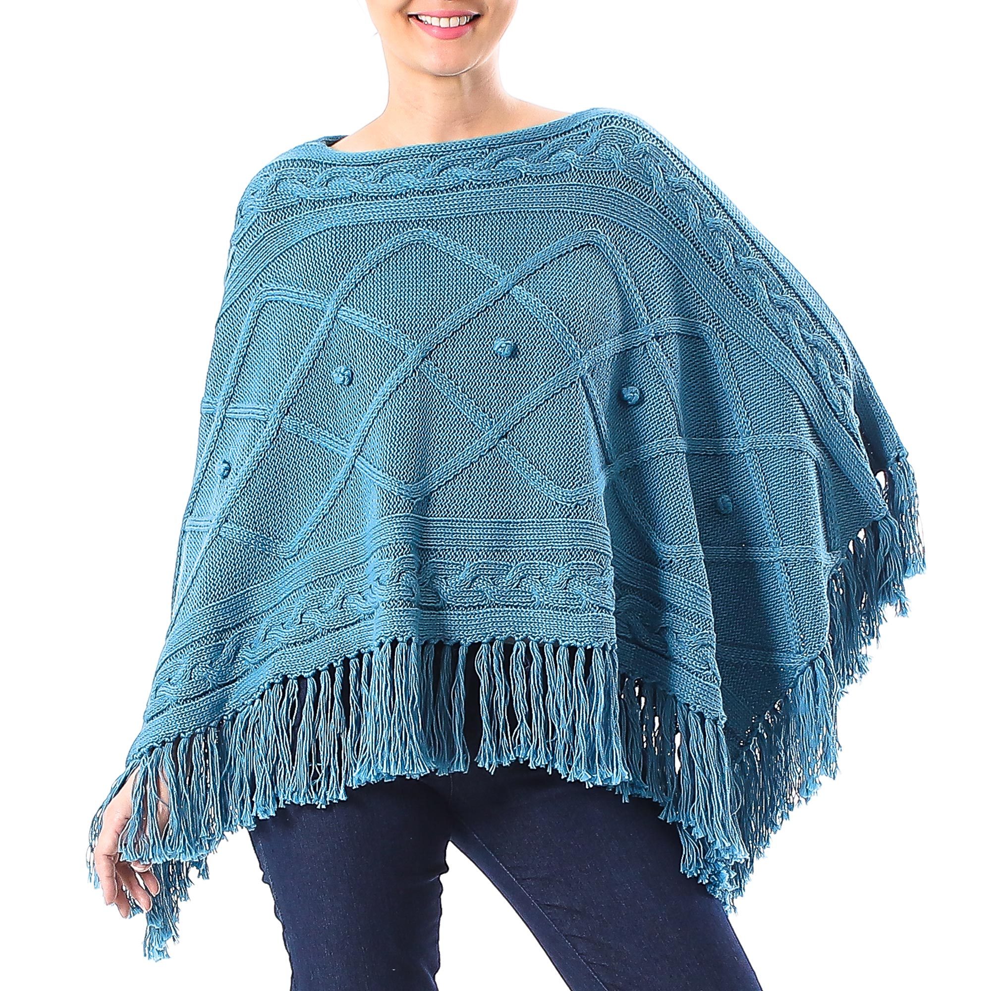 Short Knit Cotton Poncho in Cerulean from Thailand, 'Charming Knit in Cerulean'
