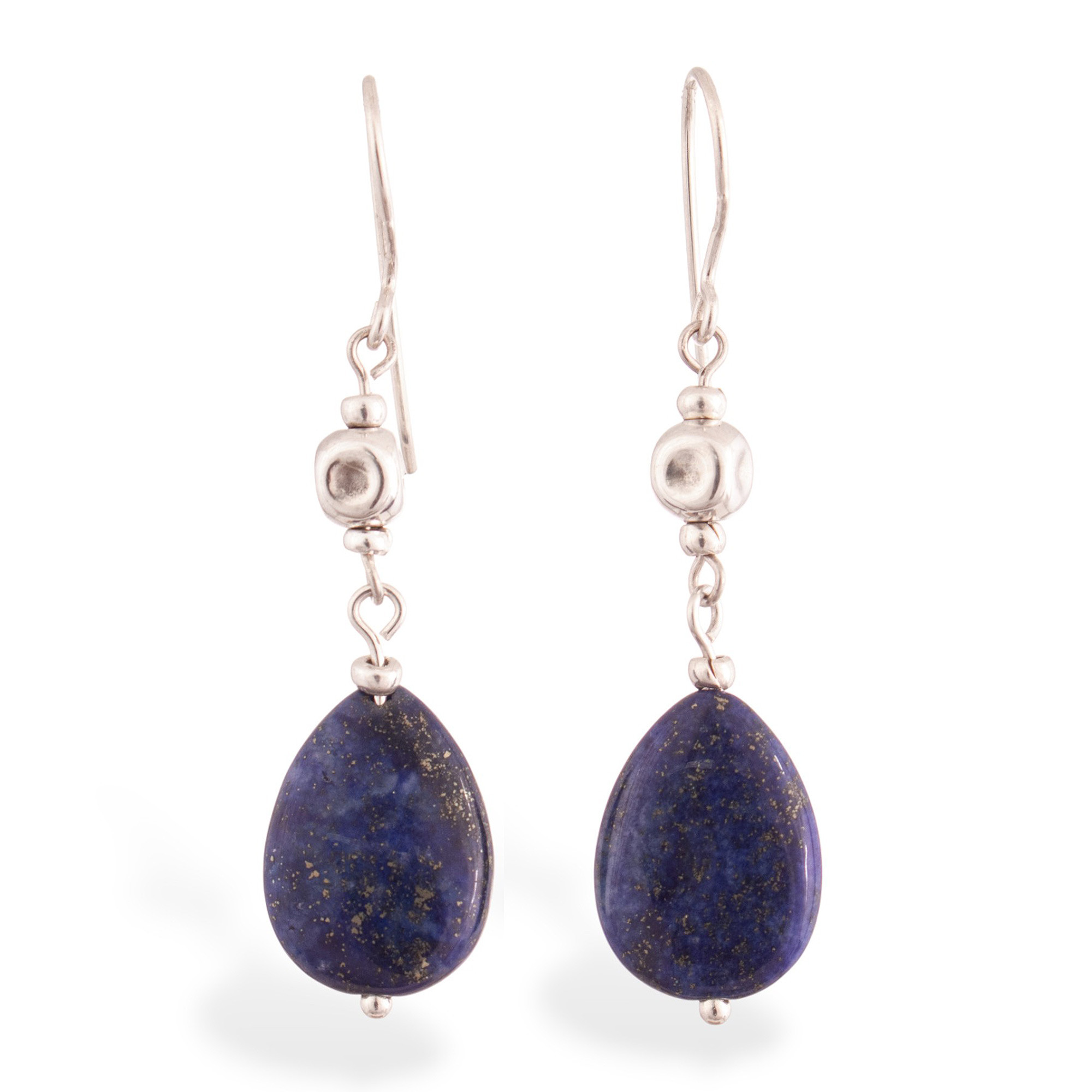 Silver Dangle Earrings with Teardrop Lapis Lazuli Gemstones, 'Drops of the Open Sea'