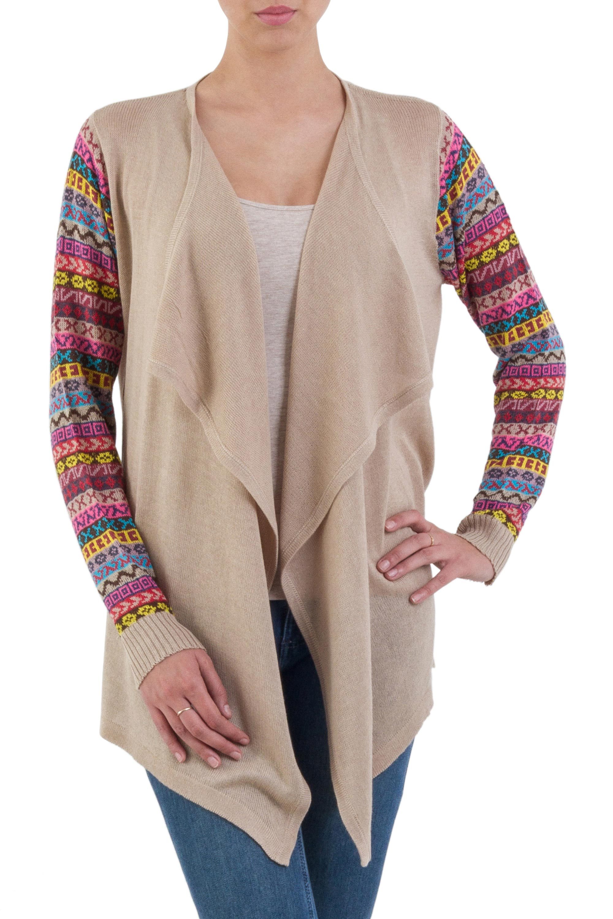 Solid Beige Cardigan with Open Front and Multicolor Sleeves, 'Pisac Market in Pale Beige'