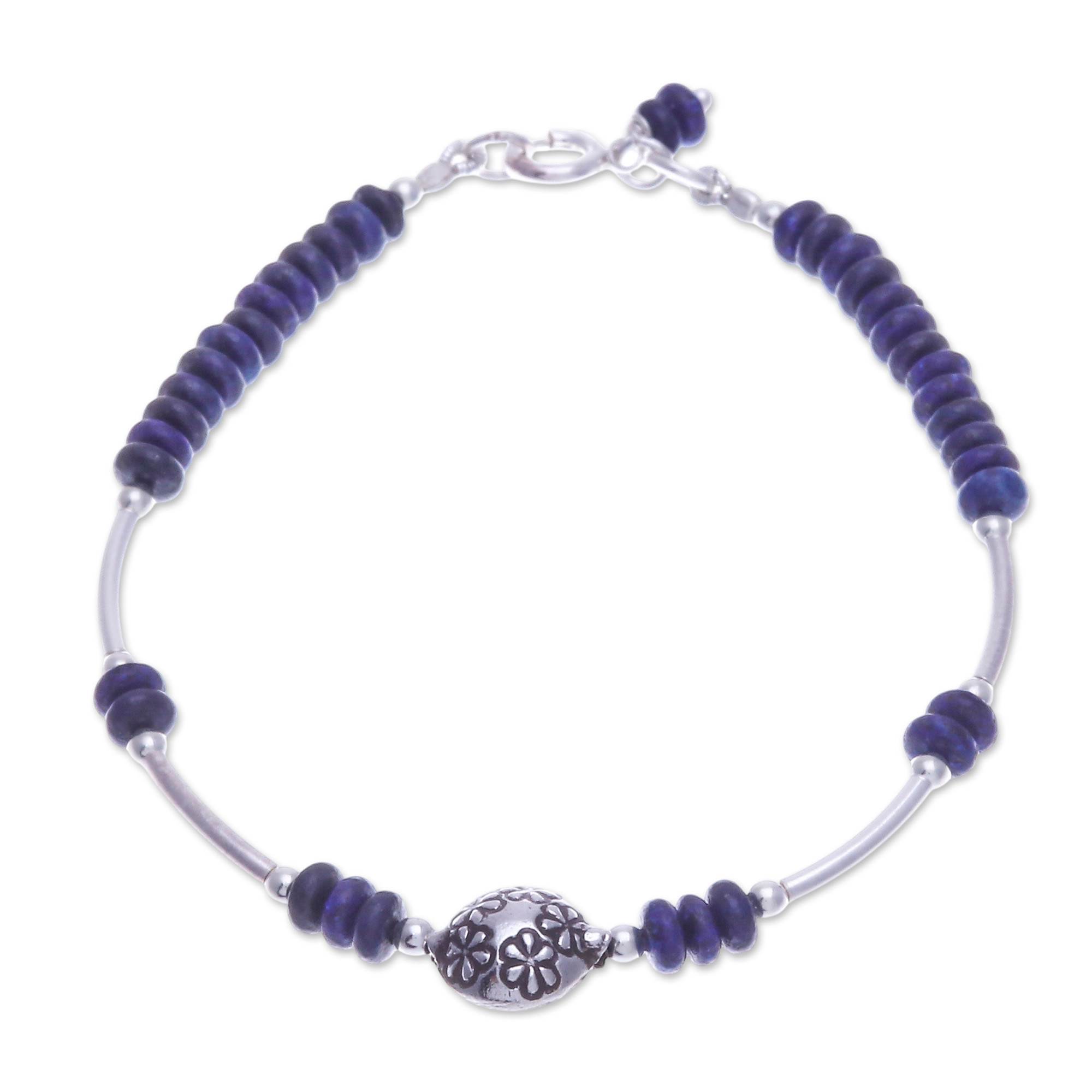 Sterling and Karen Silver Blue Lapis Lazuli Beaded Bracelet, 'Daisy Crown in Blue'