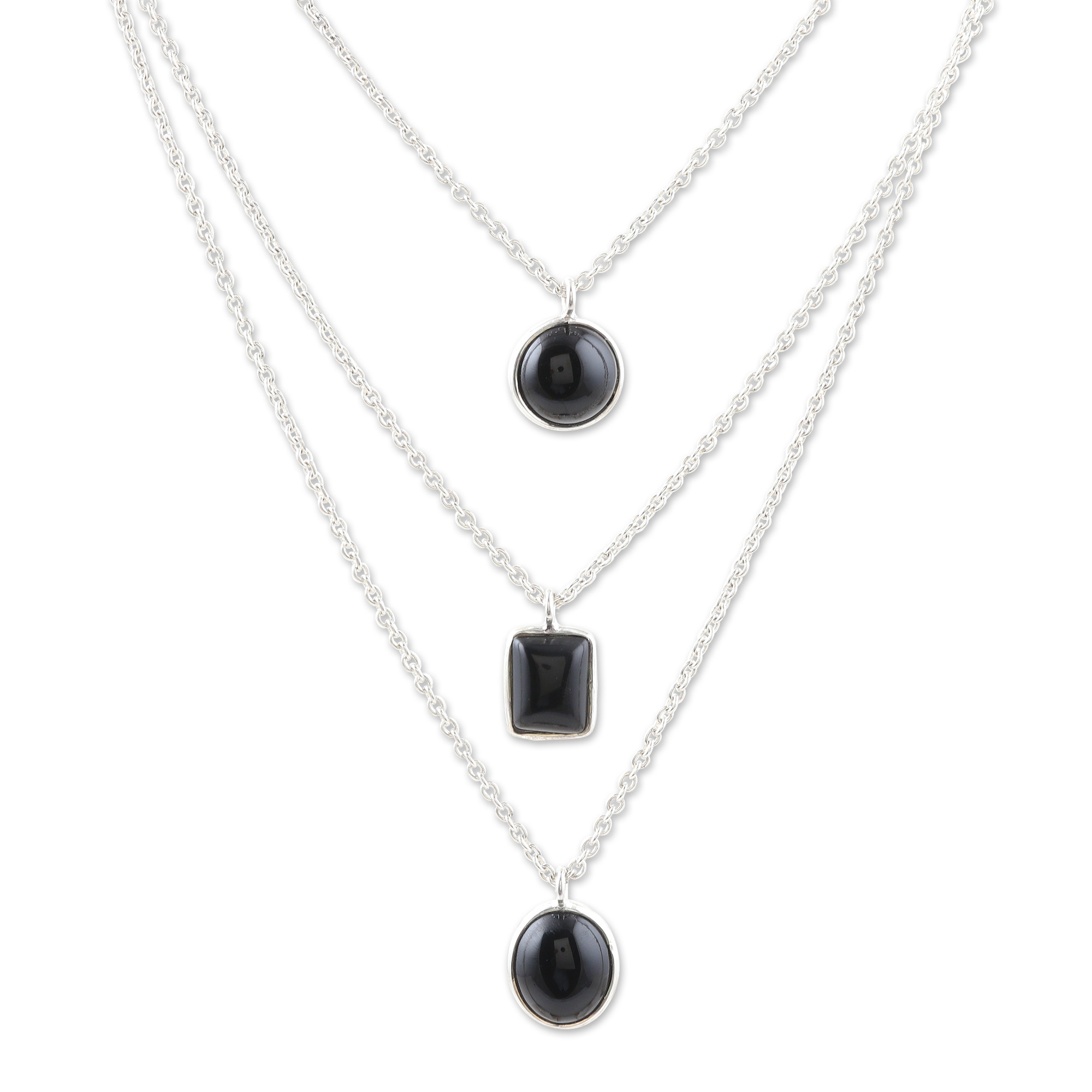 Sterling Silver 3-Strand Black Onyx Pendant Necklace, 'Protection Shapes'