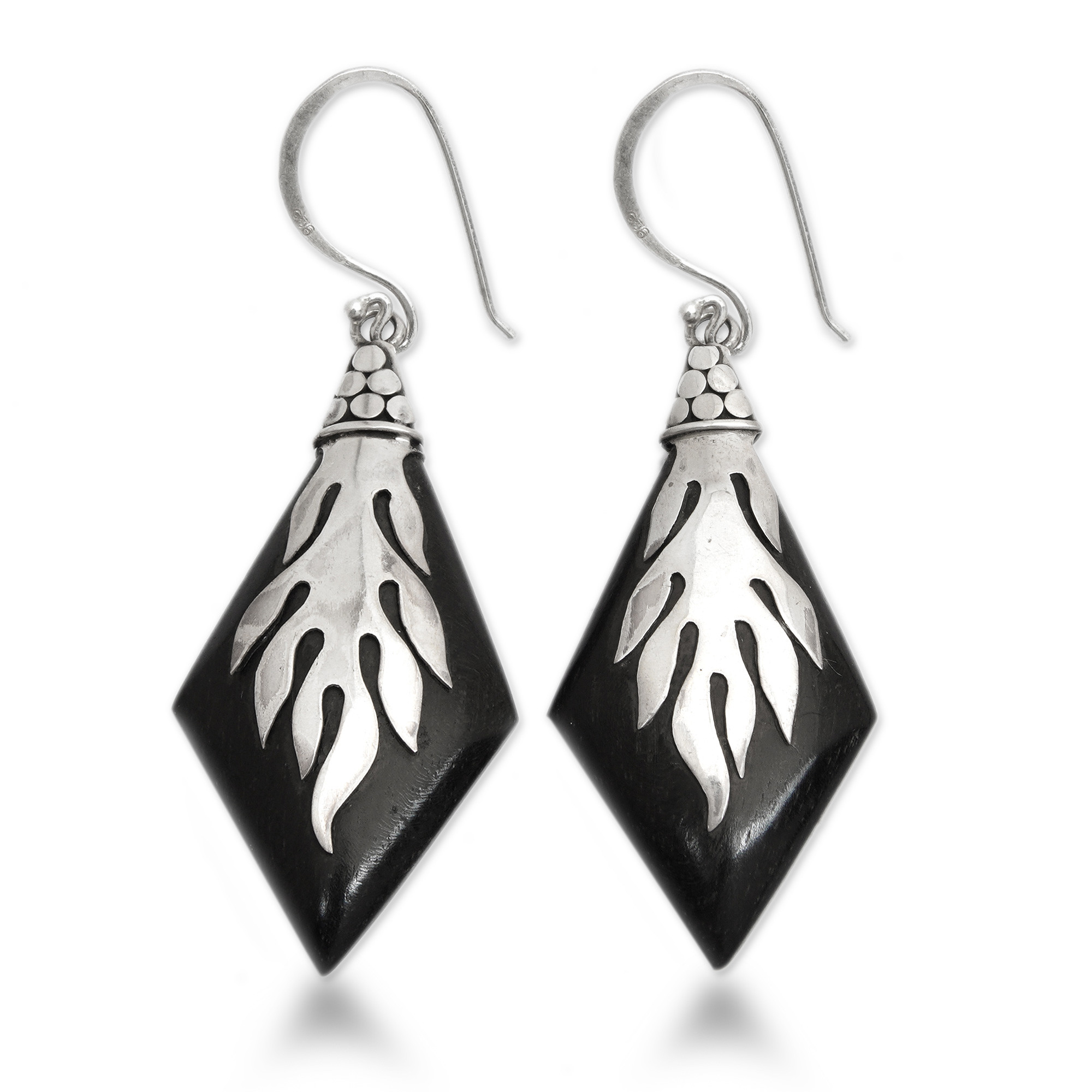 Sterling Silver and Sono Wood Diamond Shaped Earrings, 'Diamond Flame'