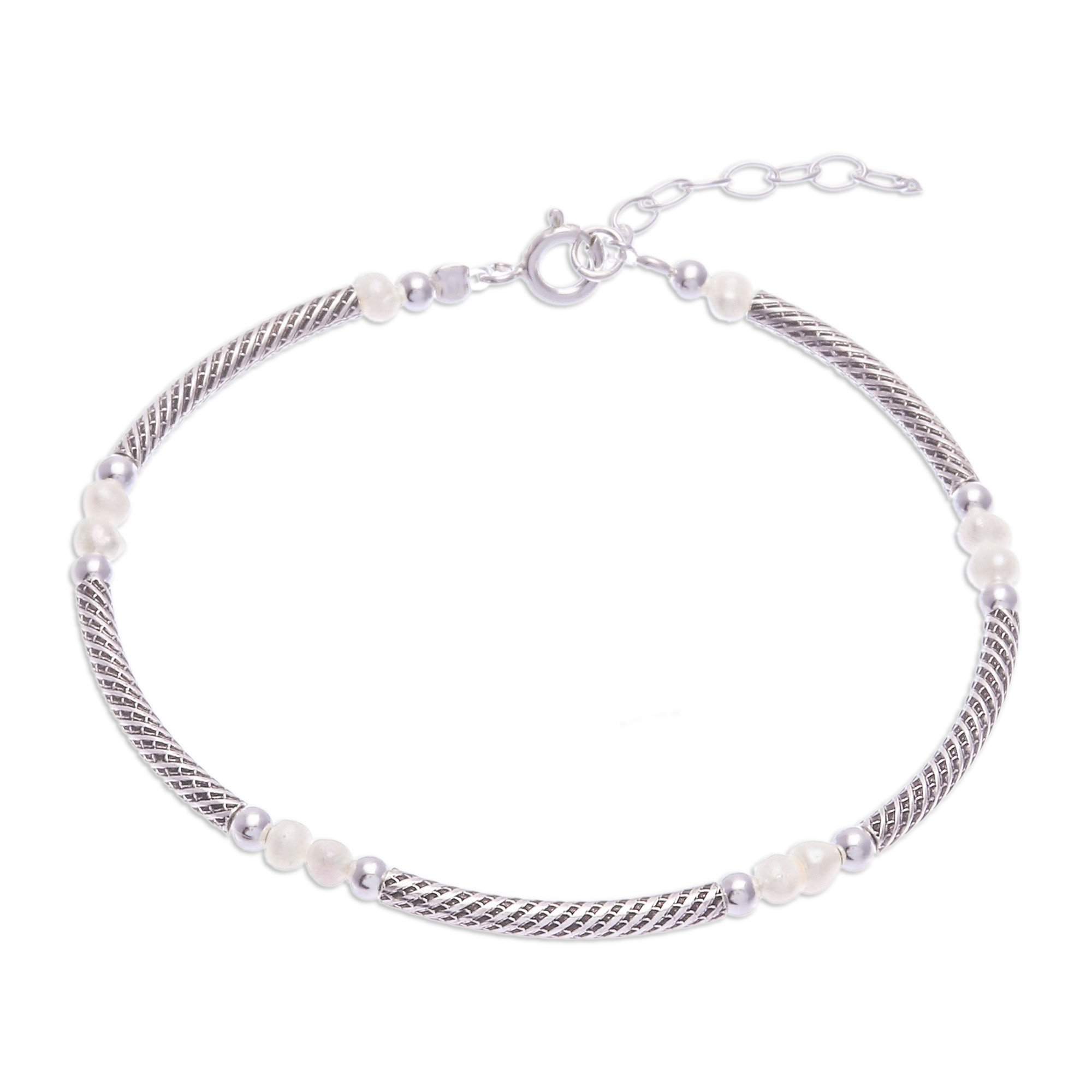 Sterling Silver Chain Bracelet with White Cultured Pearls, 'Future Elegance'