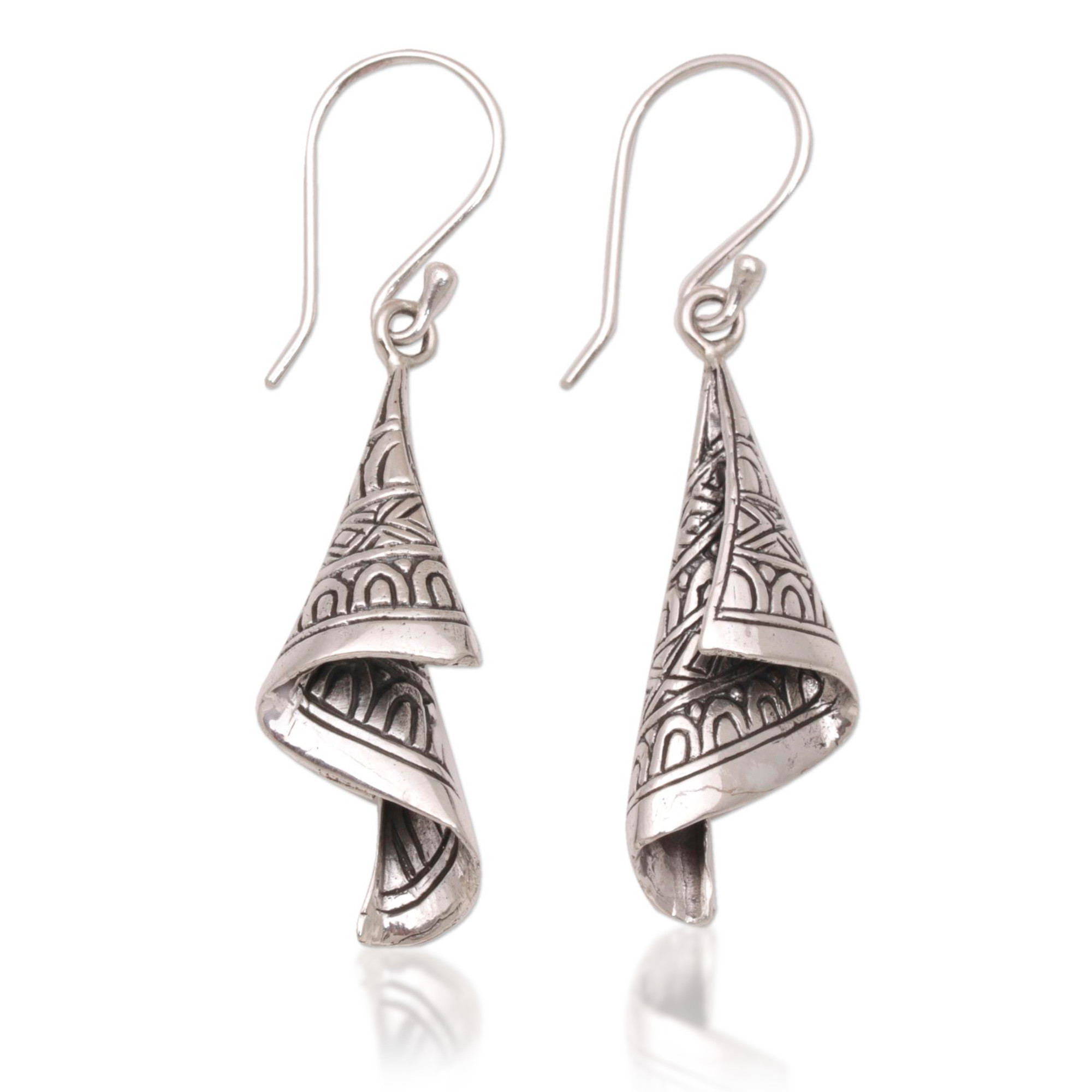 The waving shapes of songket cloth is captured in sterling silver, handcrafted by Balinese artisan Dewa Arimbawa to dangle from the ears. Songket is a traditional type of decorative cloth woven from silk or cotton with shimmering metallic threads. The elegant nature of songket is captured in these earrings, featuring designs accented by a combination of finishes.