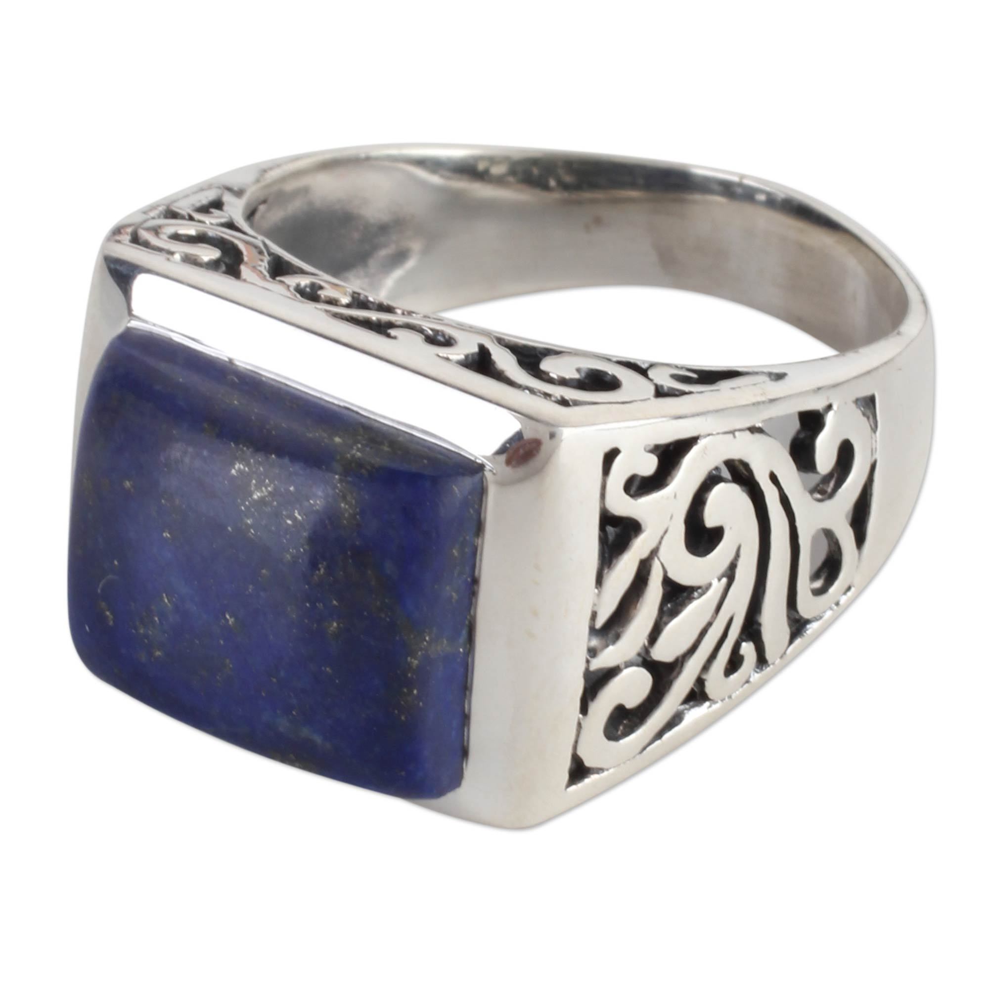 This stunning ring is designed by Indian artisan Alok Jain. The top of the ring displays a cabochon lapis lazuli gemstone placed in a sterling silver setting. The sides of the ring are designed with an intricate jali openwork design featuring leaves and vines. Lapis lazuli is said to relieve anger and negative thoughts, making it a positive and fitting accessory to add to your wardrobe.