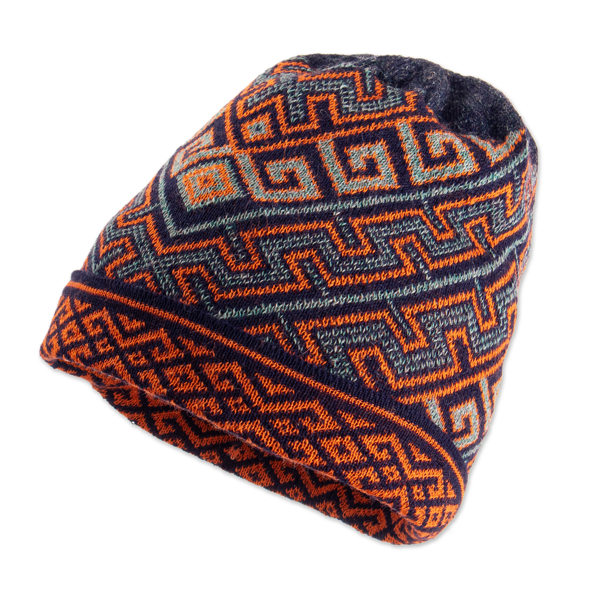 Unisex 100% Baby Alpaca Knit Hat in Aqua and Orange, 'Andean Style'