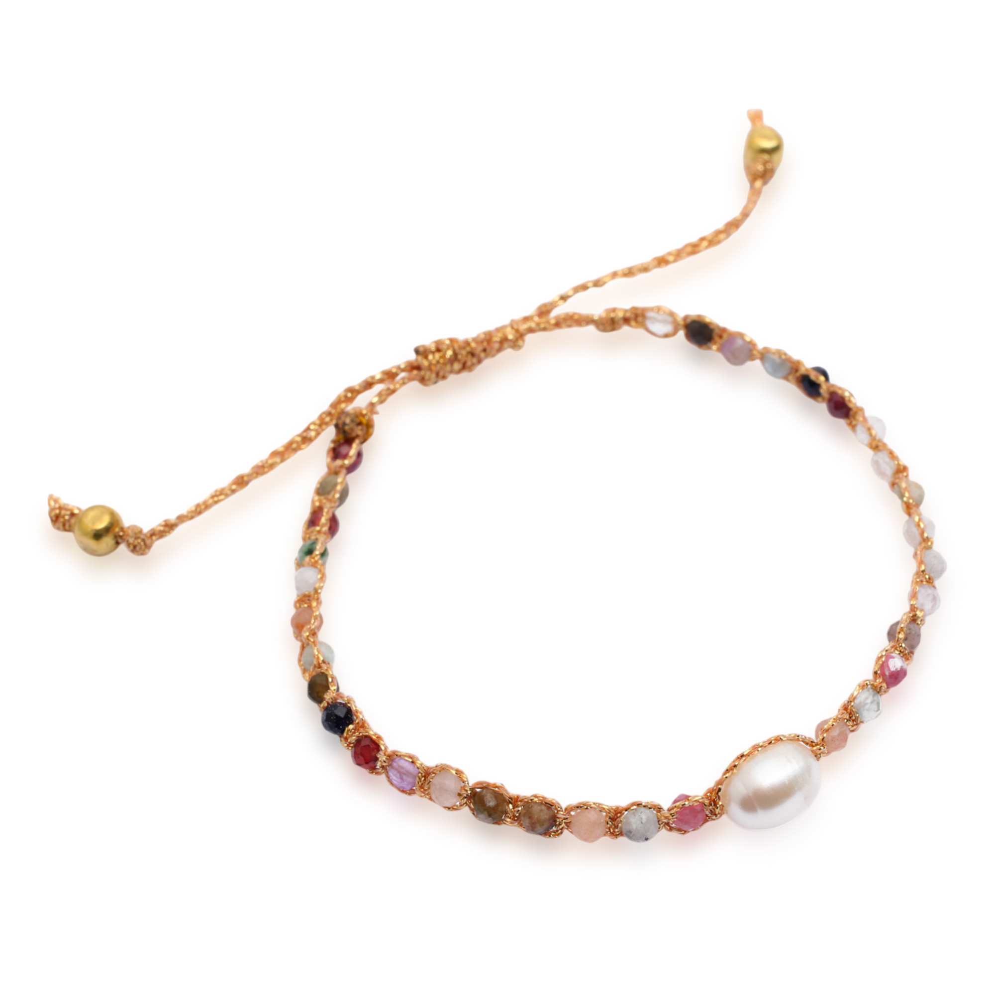 • Agate, cultured pearl, 18k gold-plated brass, polyester threads