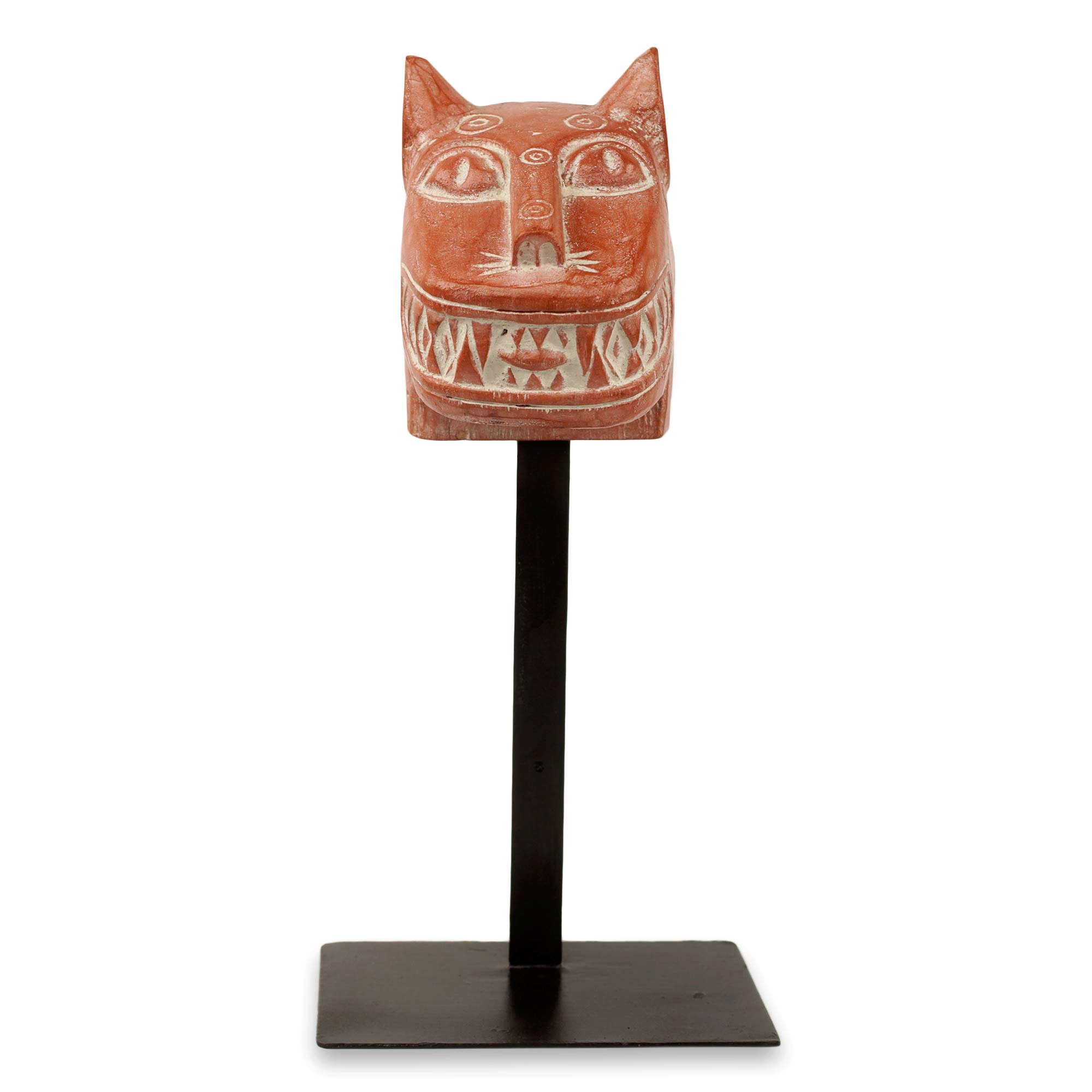 A fierce grin brings this leopard mask to life. Designed by Rita Addo Zakour, the expressive mask is carved by hand of sese wood. Treated with white clay for an aged finish, the mask is displayed on an iron stand.