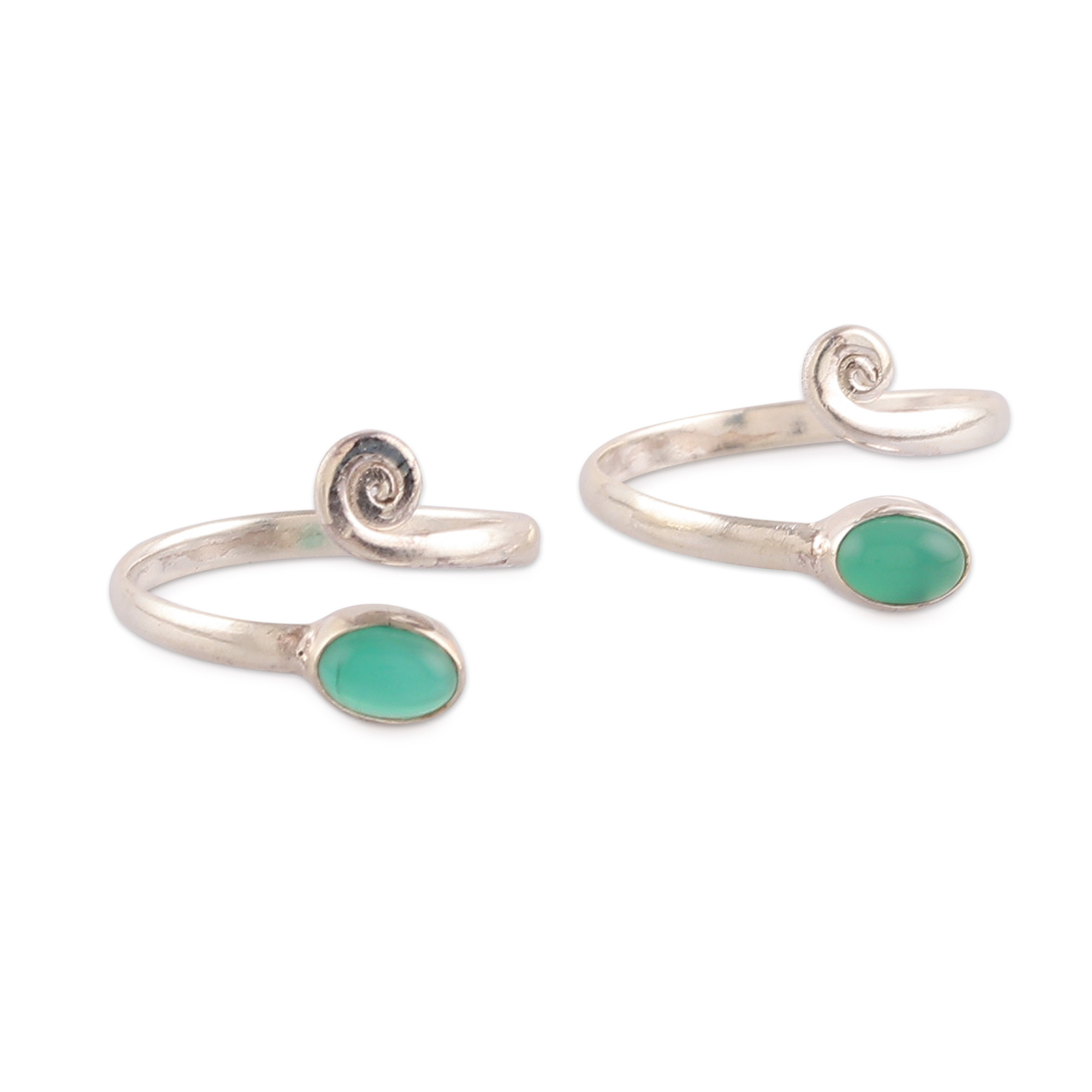 Boast a harmonious essence on all your sides with Alok Jain's classic toe rings. Local Indian artisans follow bohemian trends to craft this sterling silver pair, accented with sweet curls in a high polish finish. Green onyx jewels crown those windy motifs, evoking an evergreen landscape.