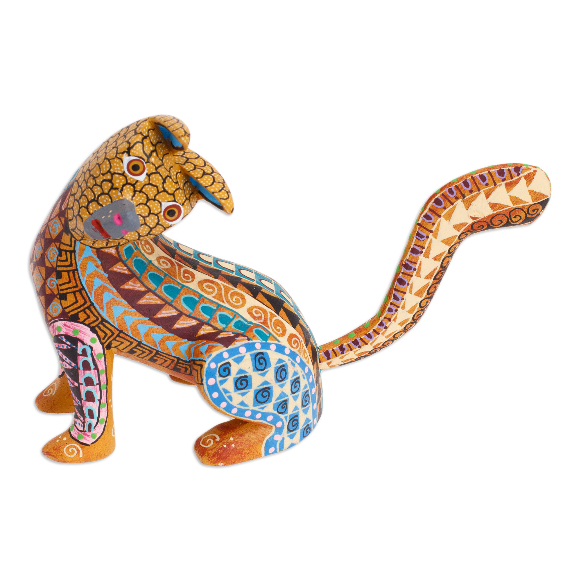 This endearing hand-painted cat alebrije figurine embodies the essence of Mexico's rich cultural tradition. Artisans Jesus and Roxana Hernandez expertly handcraft this lovely decorative accent from copal wood, bringing it to life with intricate motifs in gorgeous amber and blue hues. Please note the tail is detachable for easy shipping.