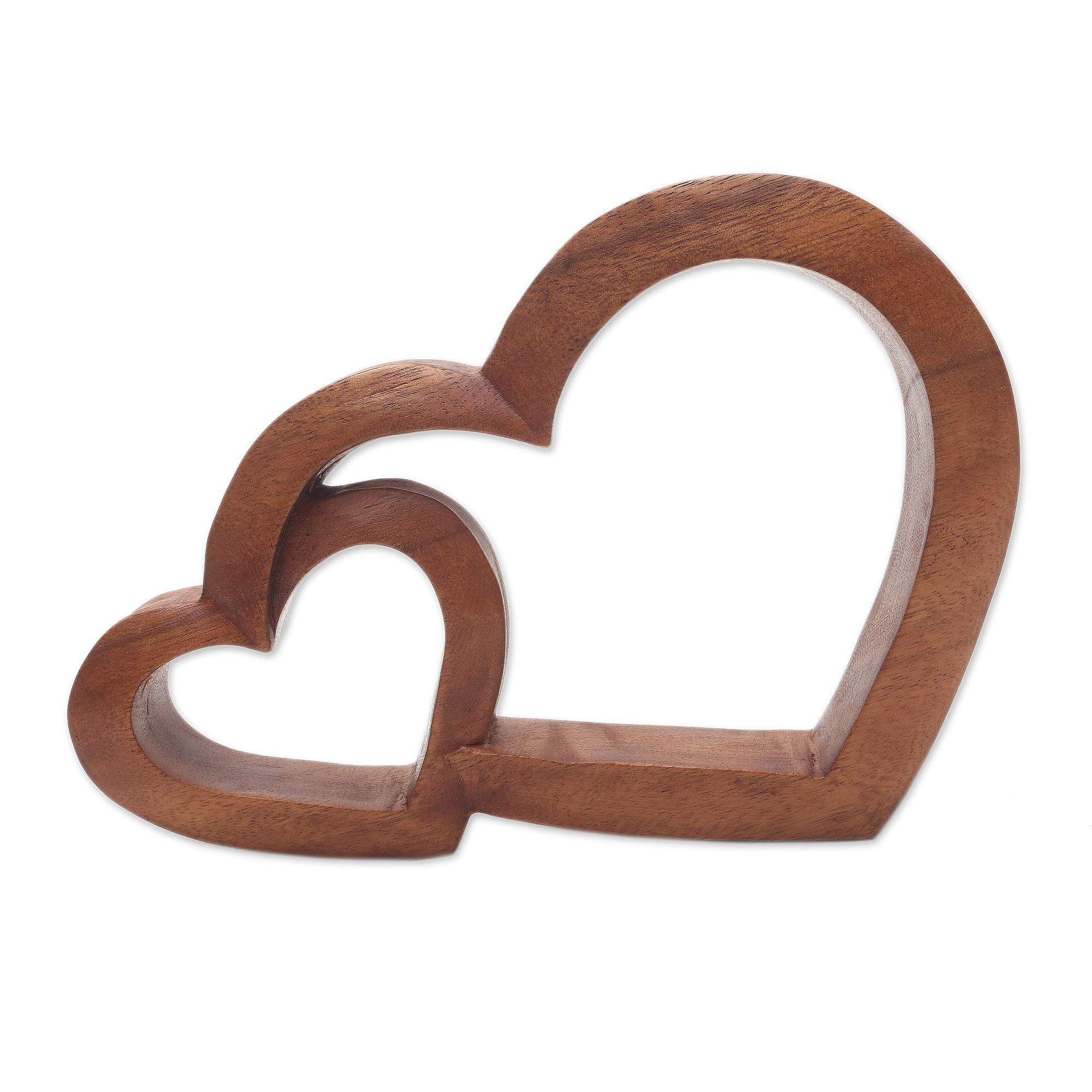 Two hearts come together as one in this tender expression of love and sharing. Presented by Eka, from Indonesia, this sculpture is carved from suar wood and signed by the artist.